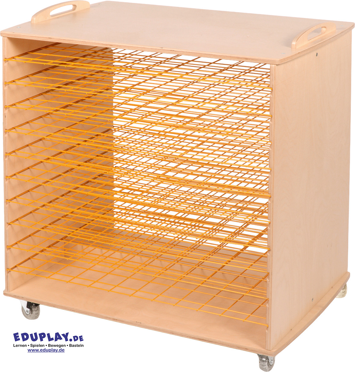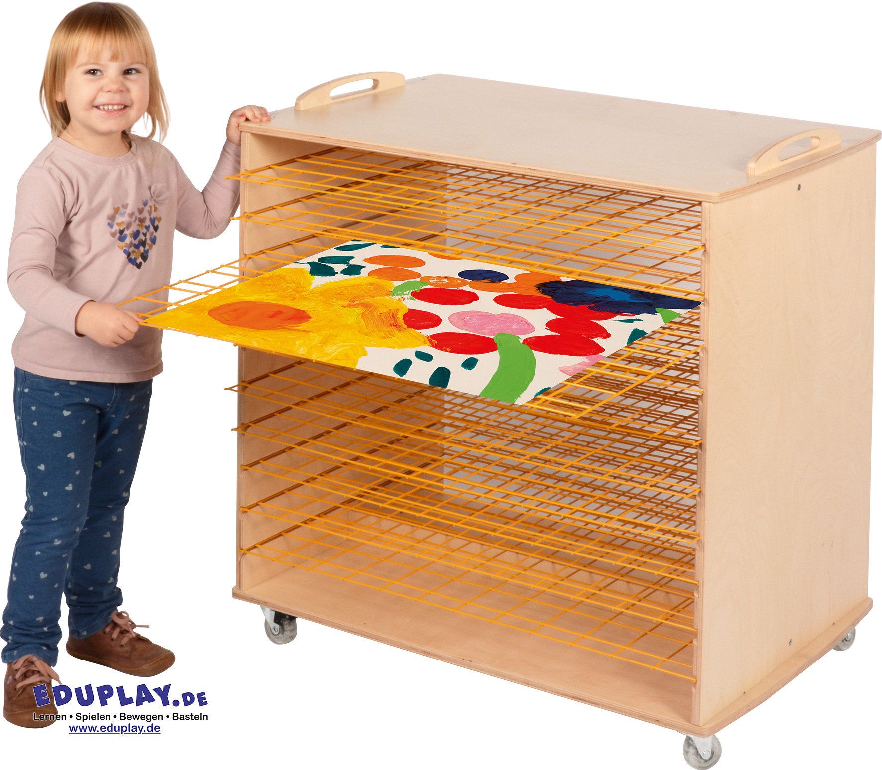 Diese hochwertigen Trockenständer aus robustem Sperrholz erleichtern es, Gemälde sauber und platzsparend zu trocknen. Sie lassen sich dank der zwei Griffe und vier transparenten Rollen – davon zwei feststellbar – besonders leicht bewegen und sicher positionieren. Durch die beidseitige Bedienbarkeit können mehrere Kinder gleichzeitig ihre Kunstwerke einsortieren.