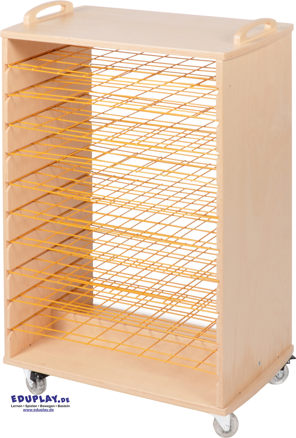 Diese hochwertigen Trockenständer aus robustem Sperrholz erleichtern es, Gemälde sauber und platzsparend zu trocknen. Sie lassen sich dank der zwei Griffe und vier transparenten Rollen – davon zwei feststellbar – besonders leicht bewegen und sicher positionieren. Durch die beidseitige Bedienbarkeit können mehrere Kinder gleichzeitig ihre Kunstwerke einsortieren. Jeder Trockenständer ist mit 10 Gitterböden aus pulverbeschichtetem Stahl ausgestattet.